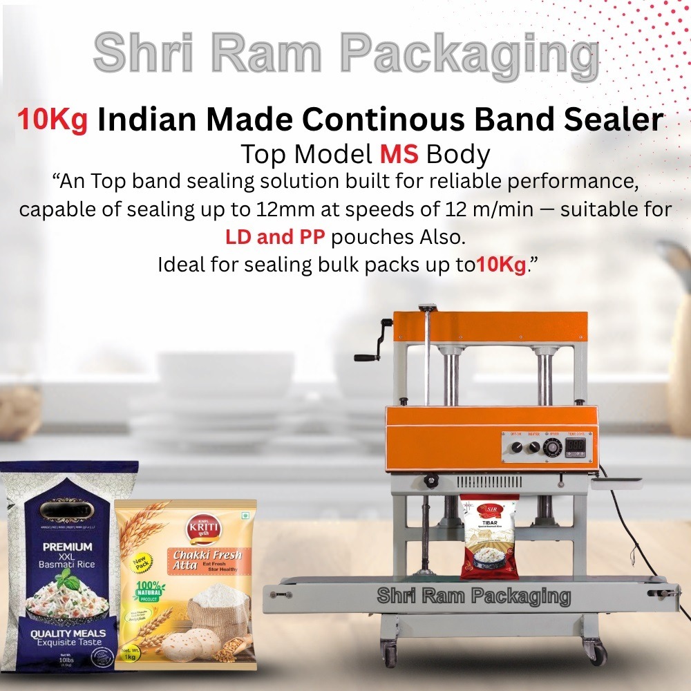 Band Sealing Machine 10KG | Indian Make Heavy-Duty BAND SEALER Band Sealing Machine 10KG is a high-capacity, heavy-duty pouch sealing solution built for large-scale packaging applications. Proudly Made in India, it’s engineered with a reinforced conveyor system and a durable heat sealing mechanism that can support up to 10 kilograms per pouch. This machine is perfect for sealing grain bags, fertilizers, seeds, dry foods, pet food, and powdered materials.