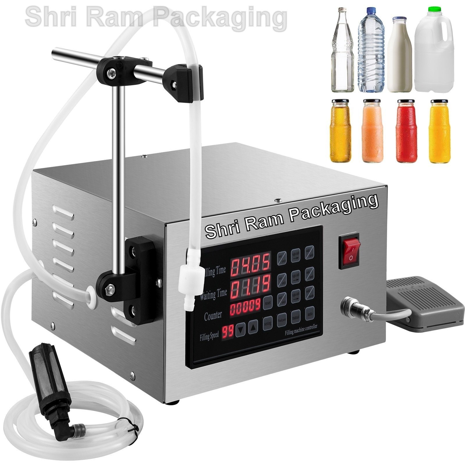 Semi-Automatic Digital Liquid Filling Machine uses micro-computer to control the mini-pump on filling time and the rotation rate of electric motor so that the machine can fill the liquid fluently and at high accuracy. It is widely used in medical, chemistry, food, beverage, oil and cosmetics, etc. It is suitable for filling low-viscous liquid without pellets. Separated with the electric motor, the pump is made of a variety of anti-corrosion imported material. There is no mechanical metal part or abrasion inside the pump. The pump can stand oil, heat, acid, alkali, abrasion and chemical products. This pump integrates the advantage of self-suck pump and chemical pump. It can self-suck , heat protect, stable working and continuous idle or load operate for long time. Features: Imported single-chip control, high efficiency, low power consumption Automatic counting, control the filling quantity effectively LCD display, touch screen panel is easy to operate Filling Accuracy is high, precise volume Wide voltage use range Product working performance is stable, long use life Self-suck function, don't need to pour Pump can stand the acid and alkali Anti-dripping design Reasonable construction design, stainless steel shelf, need GMP requirements