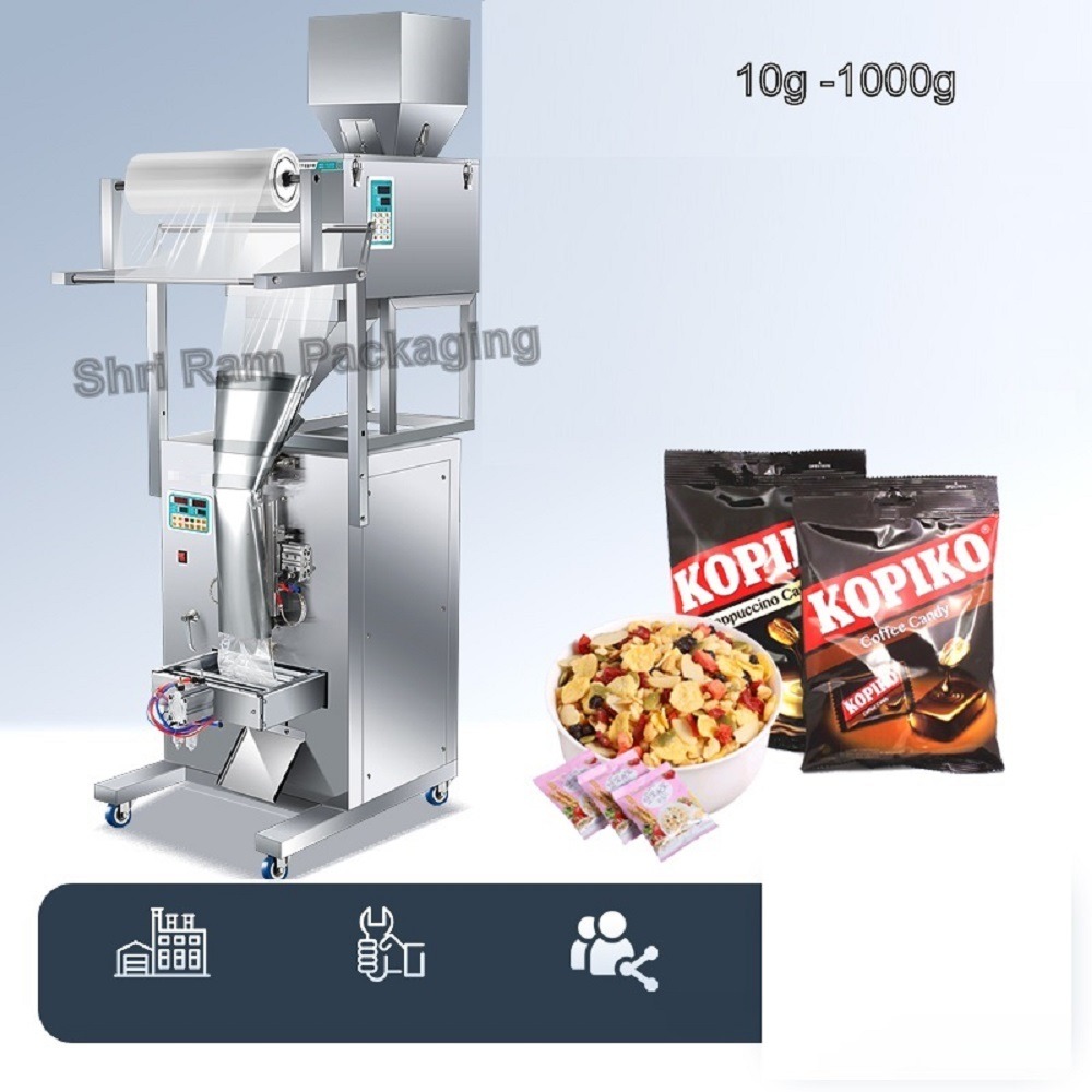 Pneumatic automatic granule pouch packing machine is suitable for weighing filling and packaging all types of granules item from 10g to 1kg packaging this machine can pack all types of granule , groceries, tea, seeds , murmura, wafers etc . This machine comes with nitrogen flushing that is optional according to customers need