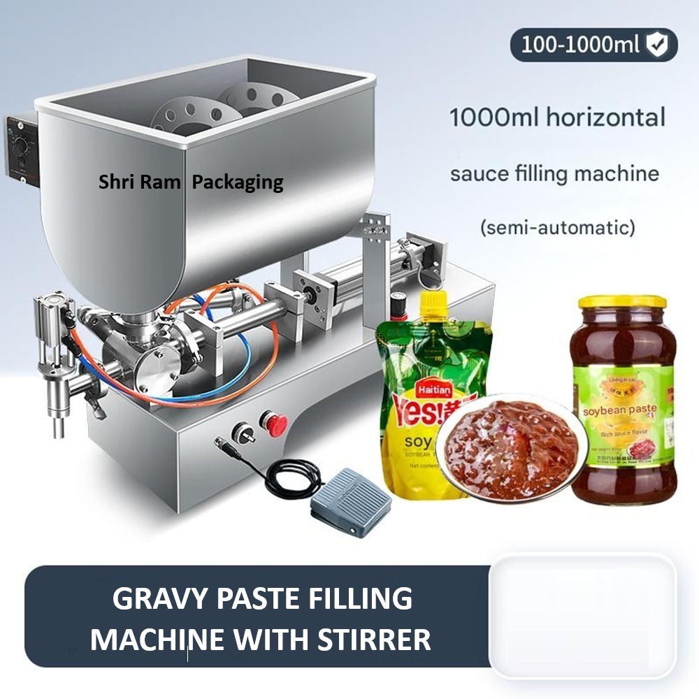 Semi-Automatic Gravy Paste Filling Machine with Stirrer hopper Filling thick and sticky products like Gravy, chutneys, pastes, and sauces requires a machine built for precision, hygiene, and smooth flow control. Shri Ram Packaging brings you high-performance Gravy Paste Filling Machine designed to handle viscous and semi-viscous products with ease. Whether you’re a food manufacturer or a homegrown brand, we offer the perfect solution — from semi-automatic paste fillers to fully automatic paste pouch packing machines. Semi-Automatic Chutney / Paste Filling Machine Ideal for startups and small food businesses, our semi-automatic paste filling machine ensures clean and accurate filling with minimal effort. Perfect for filling: Green chutney, tamarind chutney, garlic chutney Tomato paste, ginger-garlic paste Pickle base, sandwich spreads, dips Features: stirrer Hopper with jacketed heating (optional) if required Pneumatic or motor-driven piston-based filling Filling range: 100ml to 1000ml Stainless steel, food-grade construction Manual or foot pedal operation Suitable for pouches, bottles, and jars A budget-friendly solution for catering businesses, restaurant chains, and local chutney brands.